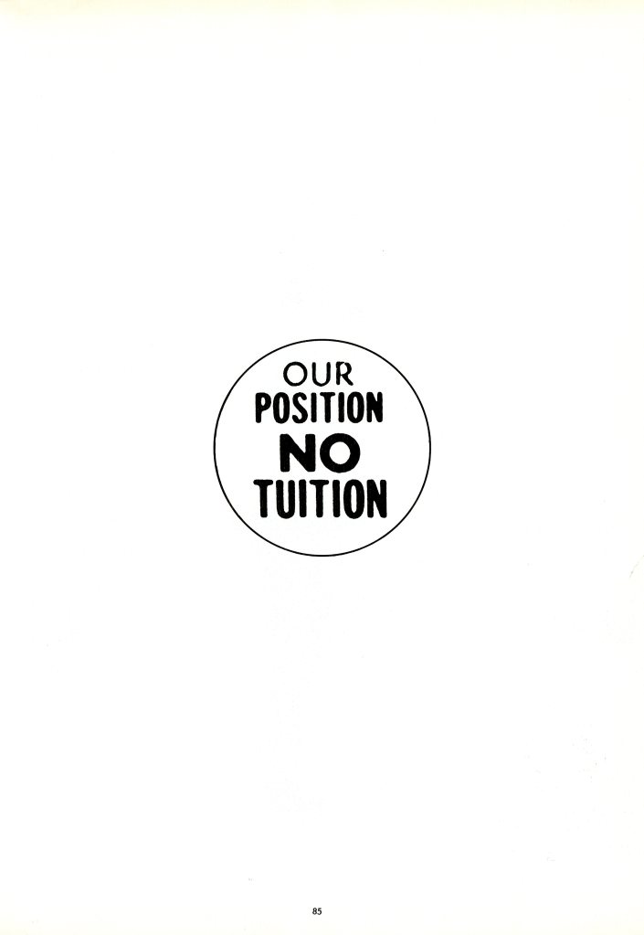 The statement “OUR POSITION IS NO TUITION” reveals that free and affordable tuition was always a main concern for students. Free tuition ended in 1976, coinciding with an influx of Black and Latino undergraduate students into CUNY schools. This added pressure for the Board of Higher Education (BHE) to adopt an open admissions policy, which went into effect in 1970.