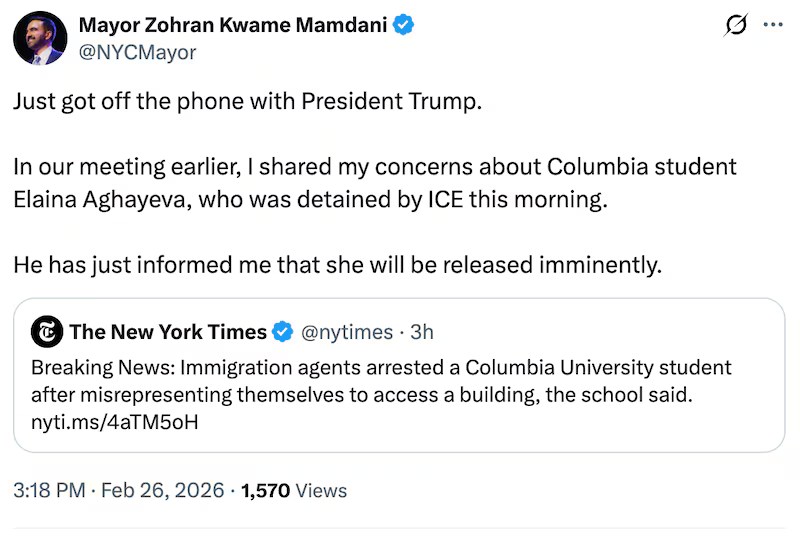 Aghayeva was taken to an ICE facility in Lower Manhattan and detained for several hours. She was ultimately released later that day after Mayor Mamdani beseeched President Trump to release the 29-year-old Columbia Senior. News of the arrest made national headlines and sparked social media discourse about the legality of the arrest and the agents’ tactics.